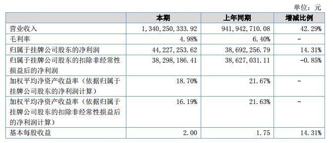 報(bào)告期內(nèi),公司實(shí)現(xiàn)營業(yè)收入134,025.03萬元,同比增長42.29%;營業(yè)成本127,345.76萬元,同比增長44.43%;營業(yè)利潤5,833.41萬元,同比增長14.97%,歸屬于掛牌公司股東的凈利潤4,422.73萬元,同比增長14.31%?