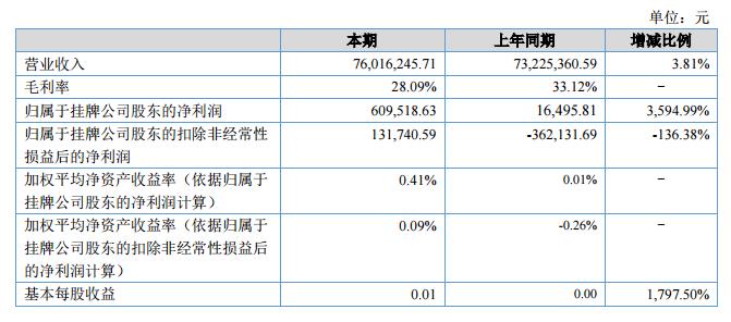 報告期內(nèi),公司全年實(shí)現(xiàn)營業(yè)收入76,016,245.71元,比上年同期提升3.81%;利潤總額440,286.29元,而上年同期為負(fù)值;歸屬母公司股東的凈利潤609,518.63元,比上年同期提升3594.99%。?
