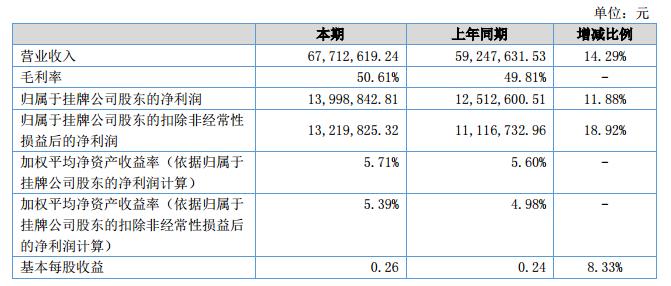 報(bào)告期內(nèi)公司實(shí)現(xiàn)收入67,712,619.24元,較上年同期增加8,464,987.71元;營(yíng)業(yè)成本33,446,560.07元,較上年同期增加3,707,524.12元;實(shí)現(xiàn)凈利潤(rùn)13,998,842.81元,較上年同期增加1,486,242.30元。