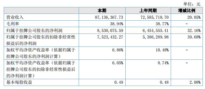 報告期內,公司實現(xiàn)營業(yè)收入87,136,367.73元,較上年同期增長14,550,649.03元,增長比例20.05%;?凈利潤8,530,075.59元,同比增長32.16%。