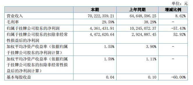 報(bào)告期內(nèi)公司營業(yè)收入70,222,359.21元,比去年同期的64,648,596.25元,增長了8.62%;公司凈利潤3,693,998.78元,比去年同期的9,997,571.82元,下降了63.05%。