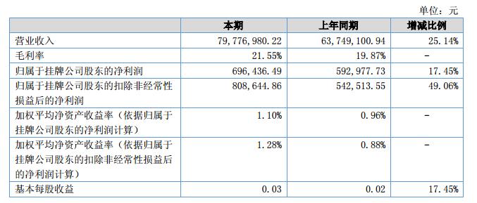 報告期內(nèi)公司實現(xiàn)營業(yè)收入7,977.70萬元,同比增加1602.79萬元,增幅25.14%;實現(xiàn)歸屬于母公司凈利潤69.64萬元,同比增加10.34萬元,增幅17.45%。?