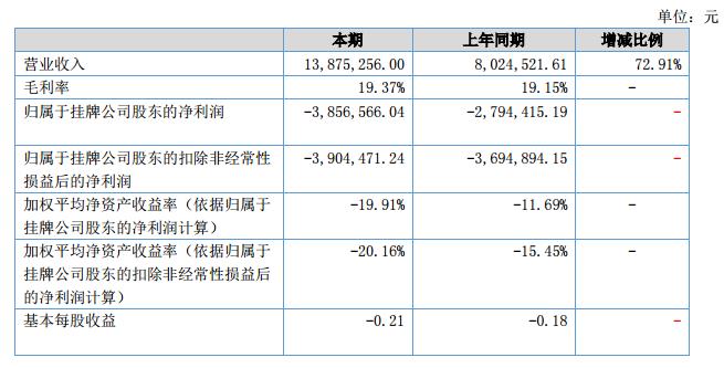 報(bào)告期內(nèi)公司實(shí)現(xiàn)營業(yè)收入1387.52萬元,同比增長72.91%;凈利潤為-385.66萬元?。