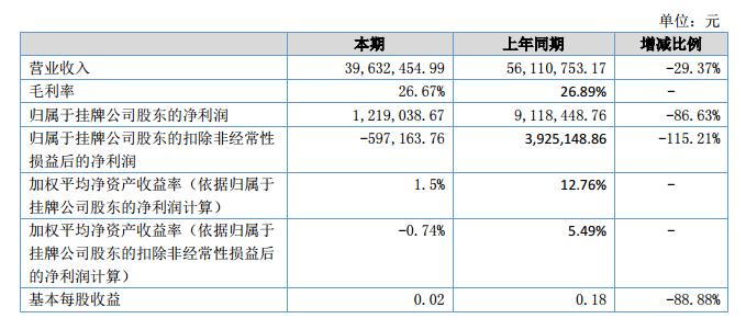 報告期內(nèi)公司實現(xiàn)營業(yè)收入3,963.24萬元,比去年同期減少了1,647.83萬元,同比下降29.37%;凈利潤1,219,038.67萬元,較去年同期減少了789.94元,同比下降86.63%。