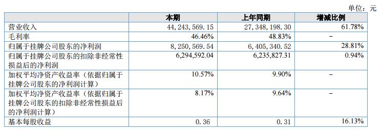 報告期內(nèi),公司營業(yè)收入為44,243,569.15元,比上年度同期的27,348,198.30元增加61.78%;報告期內(nèi),公司實現(xiàn)凈利潤為7,537,721.27元,比上年同期的6,444,330.75元增加16.97%。