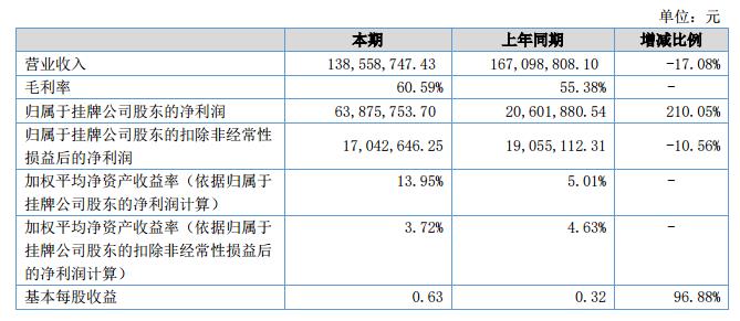 報告期內(nèi),實(shí)現(xiàn)營業(yè)收入13,855.87萬元,較去年同期減少17.08%;凈利潤6,387.58萬元,比去年同期增加210.05%。?