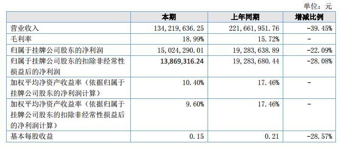 公司實(shí)現(xiàn)營業(yè)收入134,219,636.25元,較上年同期下降39.45%;營業(yè)成本108,727,275.83元,較上年同期下降41.80%;公司實(shí)現(xiàn)凈利潤15,024,290.01元,較上年同期下降22.09%。?