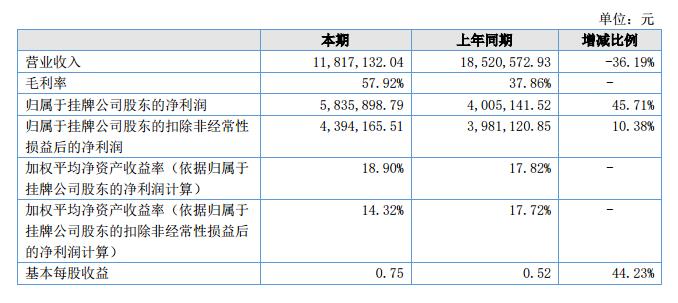 報告期內(nèi)公司實現(xiàn)營業(yè)收入1,181.71萬元,較上年同期減少36.19%;報告期內(nèi)凈利潤為583.59萬元,比上年同期增長了45.71%。