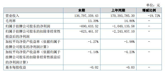 報(bào)告期內(nèi)公司實(shí)現(xiàn)營業(yè)收入1.37億,較上年同期1.70億減少3,360萬,同比下降19.72%;報(bào)告期實(shí)現(xiàn)凈利潤-68萬,較上年同期-104萬減少虧損36萬。?