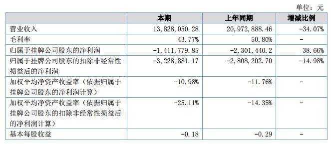 報告期內(nèi)公司實現(xiàn)營業(yè)收入13,828,050.28元,較上年同期減少-34.07%;凈利潤-1,411,779.85元,上年同期為-2,310,169.78元。