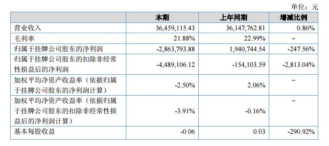 報告期內(nèi),公司營業(yè)收入3,645.91萬元,與上年同期的營業(yè)收入3,614.78萬元相比,略微有所增長;凈利潤為-282.99萬元,同比下降262.03%?