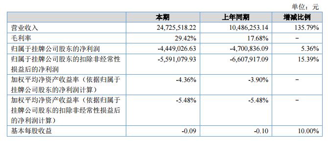 報(bào)告期內(nèi),公司實(shí)現(xiàn)營(yíng)業(yè)收入為24,725,518.22元,上年同期為10,486,253.14元,營(yíng)業(yè)收入較上年同期增加14,239,265.08元,增加比例為135.79%;公司實(shí)現(xiàn)凈利潤(rùn)為-4,344,007.65元,上年同期為-5,101,792.99元,公司收入增加135.79%,凈利潤(rùn)提高14.85%?。