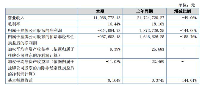 報告期內,公司實現(xiàn)營業(yè)收入11,066,772.13元,上年同期營業(yè)收入21,724,720.27元,較上年同期減少49.06%;凈利潤報告期內,公司凈利潤-824,084.73元,上年同期凈利潤1,872,726.25元,較上年同期減少144.00%。