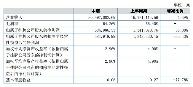 報(bào)告期內(nèi),公司實(shí)現(xiàn)營(yíng)業(yè)收入2,059.71萬元,上年同期為1,973.11萬元,增加86.60萬元,增長(zhǎng)幅度為4.39%;凈利潤(rùn)為58.49萬元,上年同期為134.11萬元,下降幅度為56.38%?。