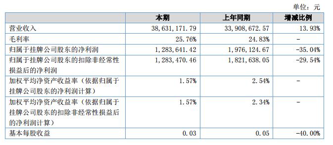 報(bào)告期內(nèi)公司完成營(yíng)業(yè)收入38,631,171.79元,較上期增加13.93%;營(yíng)業(yè)成本較上年同期增長(zhǎng)12.53%;凈利潤(rùn)1,151,107.63元,較上年同期減少39.29%。