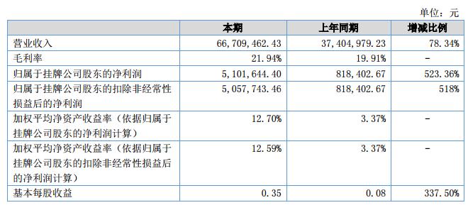報告期內(nèi)公司實現(xiàn)營業(yè)收入6670.95萬元,比上年同期增加2930.45萬元,增長率達78.34%;報告期內(nèi)實現(xiàn)凈利潤510.16萬元,比上年同期增加428.32萬元,增長率523.36%。?