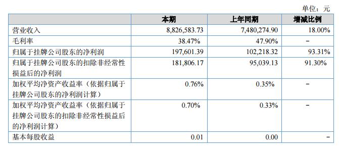 報告期內(nèi),公司實現(xiàn)營業(yè)收入8,826,583.73元,較去年同期增長18%;凈利潤197,601.39元,較去年同期增長93.31%。?