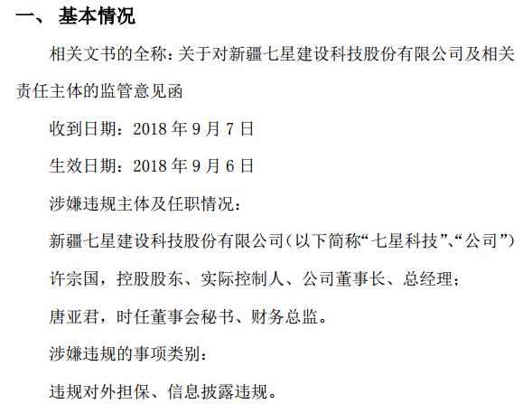 挖貝網(wǎng) 9月9日消息,新三板掛牌公司七星科技(430746)擅自為2家公司擔(dān)保,涉及金額1500萬(wàn),七星科技、董事長(zhǎng)許宗國(guó)、財(cái)務(wù)總監(jiān)唐亞君被股轉(zhuǎn)處罰。