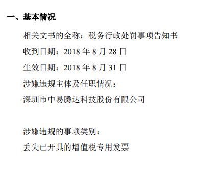 挖貝網(wǎng) 9月9日消息,新三板掛牌公司中易騰達(830982)丟失已開具的增值稅專用發(fā)票,被罰款1萬元。