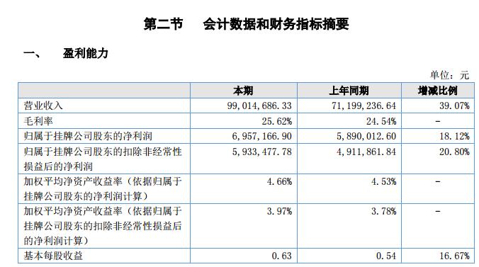 上半年,公司總資產(chǎn)為28,225.89萬元,比上期期末增加 14.38%。應(yīng)收票據(jù)及應(yīng)收賬款為7,923.88 萬元,比上期期末增加 5.96%,主要系報告期內(nèi)公司營業(yè)收入 9,901.47 萬元,較去年同期增加 39.07%;公司總負債為為 12,946.67 萬元,較上期期末增加 28.65%.短期借款為 4,100 萬元,比上期期末增長 78.47%,主要系公司擴大生產(chǎn)規(guī)模,設(shè)備投入需求增加。歸屬于掛牌公司股東的凈利潤 695.72 萬元較上年增長 18.12%。經(jīng)營活動凈現(xiàn)金流量為 751.26 萬元,與上年同期相比減少 1,037.07 萬元。