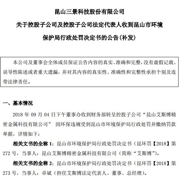 挖貝網(wǎng) 9月10日消息,新三板掛牌企業(yè)三景科技(430393) 子公司艾斯博未通過環(huán)保“三同時(shí)”驗(yàn)收開工生產(chǎn),艾斯博和法人代表卓斌被昆山市環(huán)境保護(hù)局處罰。