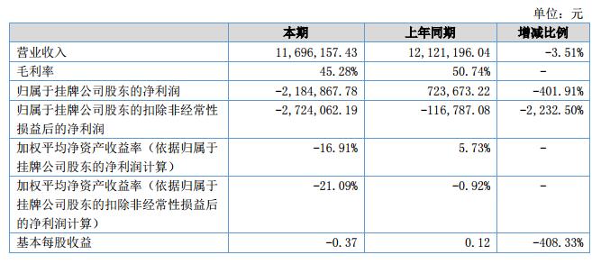 報(bào)告期內(nèi),公司實(shí)現(xiàn)營(yíng)業(yè)收入11,696,157.43元,比去年同期減少-3.51%;公司凈利潤(rùn)-2,184,867.78元,比去年同期減少401.91%%。?