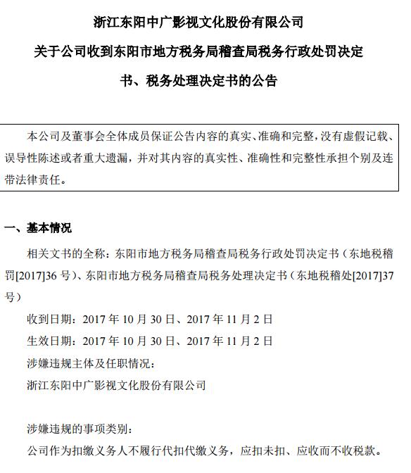 據(jù)介紹,東陽市地方稅務(wù)局稽查局于 2017 年 5 月 19 日至 2017 年 10 月 23 日對中廣影視 2014 年 1 月 1 日至 2016 年 12 月 31 日個人所得稅進行了檢查。 經(jīng)檢查,扣繳義務(wù)人不履行代扣代繳義務(wù),應(yīng)扣未扣、應(yīng)收而不收稅款,違反稅收管理。公司 2014 年分四次支付非本單位員工勞動報酬所得共 106 萬元, 未按照勞務(wù)報酬所得足額代扣代繳個人所得稅 233200 元。