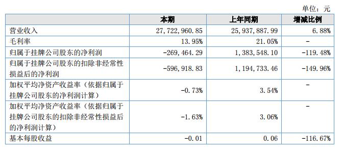 報(bào)告期內(nèi),公司實(shí)現(xiàn)營(yíng)業(yè)收入2,772.30萬(wàn)元,同比增長(zhǎng)6.88%;毛利率13.95%,較上年同期的21.05%下降7.10%;凈利潤(rùn)-173.61萬(wàn)元,同比下降227.76%;歸屬于母公司所有者的凈利潤(rùn)-26.95萬(wàn)元,同比下降119.48%。?