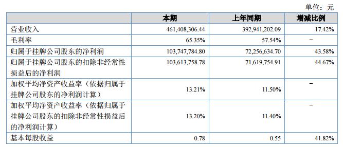 報告期內,公司共實現(xiàn)營業(yè)收入46,140.83萬元,利潤總額14,003.93萬元,歸屬于母公司所有者的凈利潤10,374.78萬元。與上年同期相比,公司的營業(yè)收入增加了17.42%,利潤總額增加43.57%,歸屬于母公司所有者的凈利潤增加43.58%。截至報告期末,公司總資產由報告期初的135,779.59萬元,增加到報告期末的149,701.95萬元。?