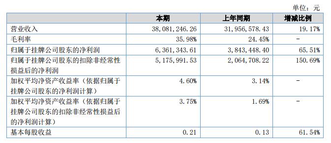 報告期內(nèi),公司實現(xiàn)營業(yè)收入3,808.12萬元,較上年同期增加612.47萬元,增長比例19.17%;發(fā)生營業(yè)總成本3,177.67萬元,較上年同期增加211.39萬元,增長比例為7.13%;實現(xiàn)凈利潤668.90萬元,較上年同期增加了92.91%。?