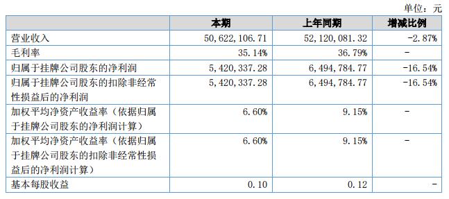報(bào)告期內(nèi)公司實(shí)現(xiàn)營業(yè)收入5062.21萬元,與上年同期相比減2.87%;公司的營業(yè)總成本4339.50萬元,和去年同期相比減少0.21%;公司的凈利潤為542.03萬元,和去年同期相比減少16.54%。