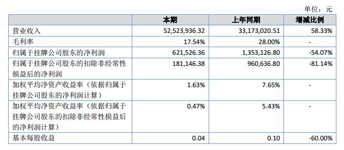 報告期內(nèi),公司實(shí)現(xiàn)營業(yè)收入5,252.39萬元,同比增長58.33%,實(shí)現(xiàn)凈利潤62.15萬元,同比減少54.07%。資產(chǎn)總額5,396.52萬元,比上年度末增長1.11%,凈資產(chǎn)3,854.95萬元。?