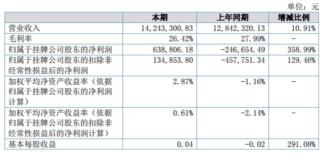 報(bào)告期實(shí)現(xiàn)營業(yè)收入14,243,300.83元,較上期上升10.91%;報(bào)告期實(shí)現(xiàn)利潤總額663,650.50元,較上期上升443.99%,凈利潤638,806.18元,較上期上升358.99%。