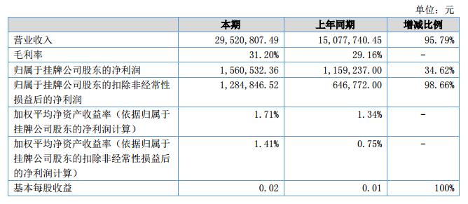挖貝網(wǎng)9月10日,銳馳高科(證券代碼:838355)近日公布的2018年半年報(bào)顯示,截至2018年6月30日,企業(yè)實(shí)現(xiàn)營(yíng)收2952.08萬(wàn)元;歸屬于掛牌公司股東的凈利潤(rùn)為156.05萬(wàn)元。