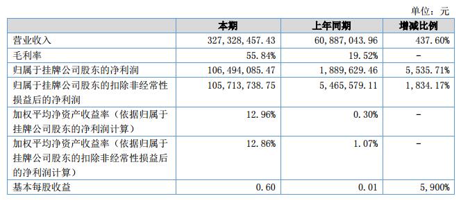 報告期內(nèi),公司實(shí)現(xiàn)營業(yè)收入327,328,457.43元,同比增加437.60%;營業(yè)成本為144,539,431.64元,較去年同期增加194.96%,毛利率為55.84%,較去年同期上升36.32%;凈利潤為106,494,085.47元,較去年同期增加5,535.71%。