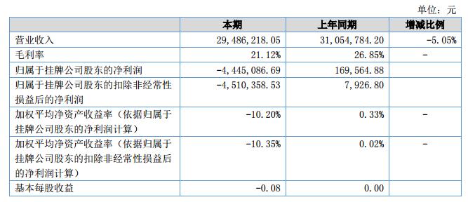 報告期內,公司實現(xiàn)營業(yè)收入2,948.62萬元,較上年同期的3,105.48萬元減少了156.86萬元,減幅5.05%;本期產品毛利率21.12%,與上年同期的26.85%減少了5.73%;本期實現(xiàn)凈利潤-444.51萬元。?