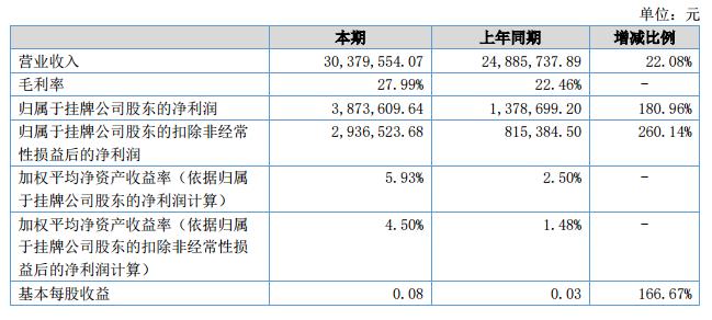 報(bào)告期內(nèi),公司實(shí)現(xiàn)營業(yè)收入30,379,554.07元,同比增長22.08%,實(shí)現(xiàn)歸屬于掛牌公司股東的凈利潤3,873,609.64元,同比增長180.96%。公司營業(yè)收入、凈利潤的增加,得益于公司積極拓展主營業(yè)務(wù)。報(bào)告期末,公司資產(chǎn)總額165,608,479.24元,同比增長20.16%,歸屬于掛牌公司股東的凈資產(chǎn)總額為67,245,572.85元,同比增長6.11%,主要系公司收入增加,盈利水平提高所致。?