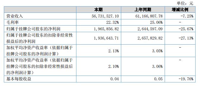 公司實(shí)現(xiàn)營業(yè)收入56,731,527.1元,同比下降7.25%;實(shí)現(xiàn)銷售毛利率22.32%,同比下降2.74%;歸屬于母公司的凈利潤1,965,856.82元,同比下降25.67%。?