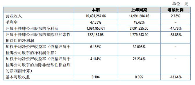 公司2018年上半年實(shí)現(xiàn)營業(yè)收入15,401,257.06元,同比增長2.73%。毛利率47.33%,同比下降2.09%;報(bào)告期內(nèi)凈利潤1,091,953.61元,對(duì)比同期2,091,225.30元,下降47.78%。?