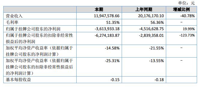 報(bào)告期內(nèi),公司實(shí)現(xiàn)營(yíng)業(yè)收入1,194.76萬(wàn)元,較上期同比下降40.78%,營(yíng)業(yè)成本581.26萬(wàn)元,較上期同比下降33.98%,主要為本期產(chǎn)品銷(xiāo)售下降所致;實(shí)現(xiàn)歸屬于母公司所有者的凈利潤(rùn)-361.39萬(wàn)元,較上年同期增長(zhǎng)19.99%,主要為其他收益中軟件退稅及其他政府補(bǔ)助增長(zhǎng)所致。截止報(bào)告期末,公司資產(chǎn)總額為5,650.73萬(wàn)元人民幣,較期初增長(zhǎng)10.73%;歸屬于母公司所有者的權(quán)益合計(jì)2,298.29萬(wàn)元人民幣,較期初下降13.59%。?