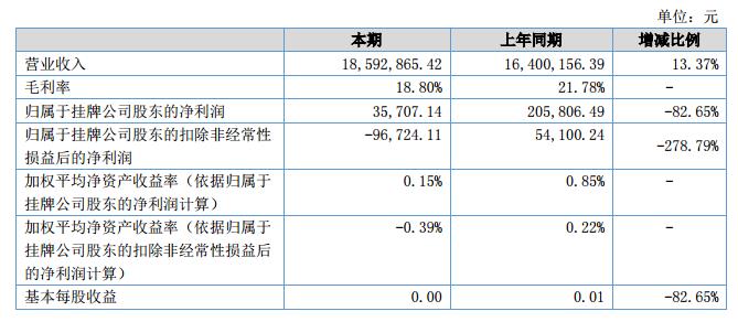 截止本報告期末,資產(chǎn)總額49,220,620.61元,較期初增長7.85%;本期實現(xiàn)營業(yè)收入18,592,865.42元,較去年同期增長13.37%,主要系報告期內(nèi)公司業(yè)務(wù)拓展后業(yè)務(wù)訂單增加所致,使得公司營業(yè)收入大幅增加;本期營業(yè)成本15,097,281.47元,較去年同期增長17.68%,主要系訂單增加且原材料價格上漲所致;本期毛利率18.80%,凈利潤35,707.14元,系因本期原材料價格上漲,導(dǎo)致毛利率有所下降;本期經(jīng)營活動產(chǎn)生的現(xiàn)金流量凈額7,993,341.21元,主要系公司本期預(yù)收賬款增加所致。