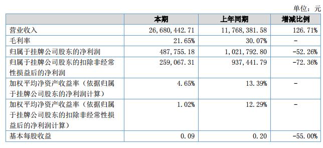 公司實(shí)現(xiàn)的營業(yè)收入為26,680,442.71元,較上年同期增加14,912,061.13元;截至報(bào)告期末,公司的營業(yè)成本為20,902,843.63元,較上年同期增加12,672,889.40元;報(bào)告期內(nèi)公司管理費(fèi)用為4,337,655.47元,較上年同期增加了2,531,186.04元;報(bào)告期內(nèi),公司凈利潤(rùn)487,755.18元,較上年同期減少了534,037.62元。