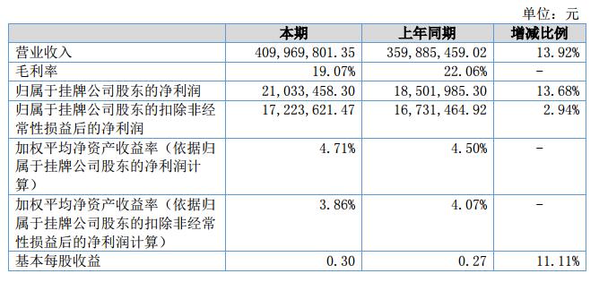 公司在報告期內(nèi)的營業(yè)收入為409,969,801.35元,比上年度增長13.92%;營業(yè)成本為331,777,394.18元,比上年度增長18.29%;歸屬于母公司的凈利潤為21,033,458.30元,比上年度增長13.68%。?
