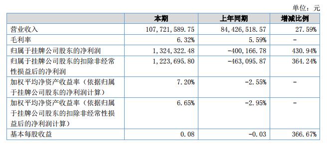 報告期內(nèi),公司主營業(yè)務收入為107,721,589.75元,較去年同期增長27.59%;歸屬于掛牌公司股東的凈利潤為1,324,322.48元,而去年同期為-400,166.78元,主要因為業(yè)務增加導致公司業(yè)績大幅改善。歸屬于掛牌公司股東的每股凈資產(chǎn)為1.2元,較去年同期增長7.14%。?