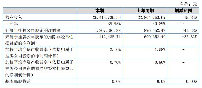 報(bào)告期內(nèi)公司實(shí)現(xiàn)營(yíng)業(yè)收入26,415,736.50元,較2017年上半年增長(zhǎng)了15.83%;營(yíng)業(yè)成本15,862,868.27元,較2017年上半年增長(zhǎng)了17.68%,主要系公司改變銷售戰(zhàn)略,多向客戶爭(zhēng)取訂單所致;凈利潤(rùn)1,267,381.88元,較2017年6月上漲41.38%,主要原因是本期政府補(bǔ)助收益增加所致。?