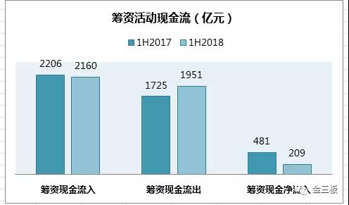 從現(xiàn)金流量表“籌資活動(dòng)產(chǎn)生的現(xiàn)金流量”來(lái)看,9393家公司上半年合計(jì)現(xiàn)金凈流入2160億元,同比下降2.09%,但現(xiàn)金凈流出1951億元,同比增加13.10%。