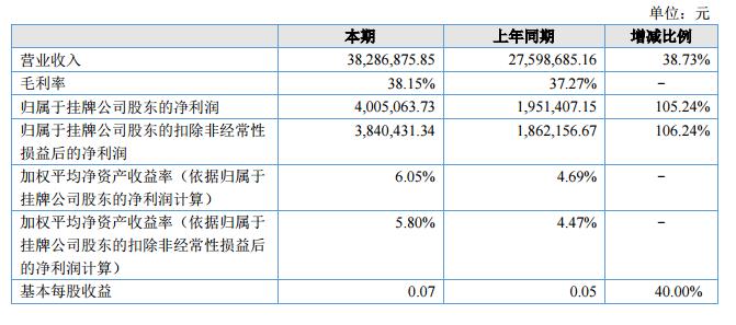 報(bào)告期內(nèi),公司實(shí)現(xiàn)營(yíng)業(yè)總收入3,828.69萬元,較上年同期增長(zhǎng)38.73%;實(shí)現(xiàn)凈利潤(rùn)400.04萬元。?