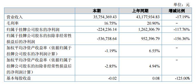 報(bào)告期內(nèi),公司營(yíng)業(yè)收入35,754,369.43元,比上年同期為43,177,934.83元同比減少17.19%,主要是因?yàn)槭苄袠I(yè)去產(chǎn)能政策和國(guó)家環(huán)保督察影響,公司產(chǎn)品生產(chǎn)供貨嚴(yán)重不足,從而使收入有所下滑。報(bào)告期內(nèi)凈利潤(rùn)為-224,236.14元,上年同期為1,262,306.79元同比減少117.76%,主要原因是報(bào)告期內(nèi)銷售收入下降,毛利率下降,造成凈利潤(rùn)同比下降。?