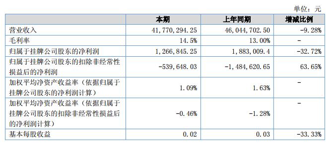 報(bào)告期內(nèi),營業(yè)收入為41,770,294.25元,去年同期46,044,702.50元,減少9.28%;營業(yè)成本35,714,614.94元,減少10.84%;凈利潤為1,233,548.05元,去年同期1,883,009.40元,減少34.49%;報(bào)告期內(nèi),公司減少毛利率較小的貿(mào)易業(yè)務(wù),擴(kuò)大釹鐵硼磁性材料業(yè)務(wù)收入為27,985,508.42元,較去年同期增加25.19%,灼燒加工業(yè)務(wù)2,906,734.34元,較去年同期增加430.13%。稀土氧化物貿(mào)易業(yè)務(wù)10,702,952.76元,較去年同期減少49.61%。增加永磁電機(jī)收入175,098.73元。?