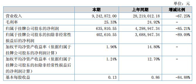 報(bào)告期內(nèi),公司實(shí)現(xiàn)營(yíng)業(yè)收入9,242,872.00元,比上年同期減少67.25%,歸屬于掛牌公司的凈利潤(rùn)635,810.55元,比上年同期減少85.21%,經(jīng)營(yíng)活動(dòng)產(chǎn)生的現(xiàn)金流量?jī)纛~為358,891.29元,比上年同期減少83.83%。?